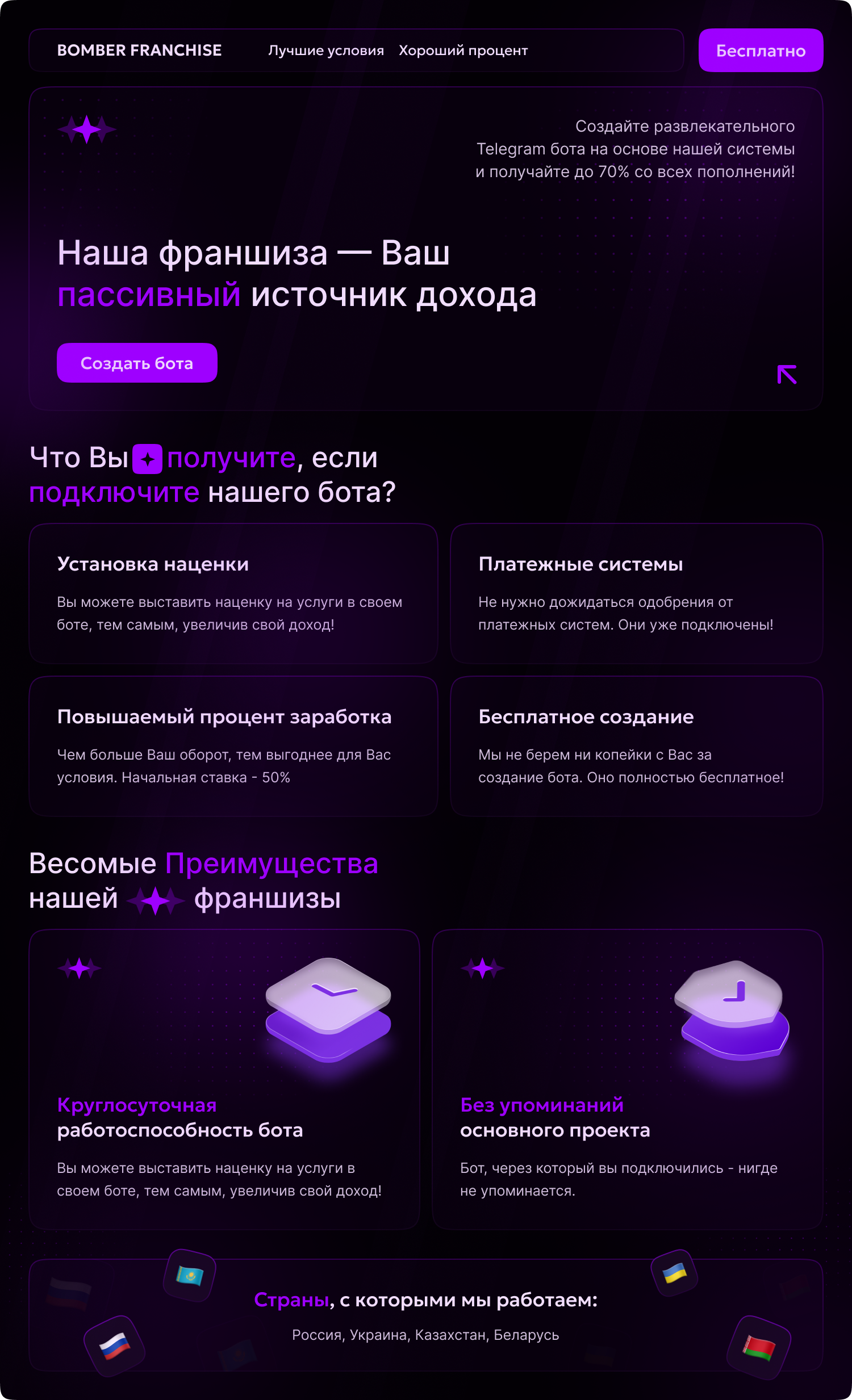 Подключайтесь к франшизе и зарабатывайте до 70% с каждого пополнения пользователя, посетившего Вашего бота.